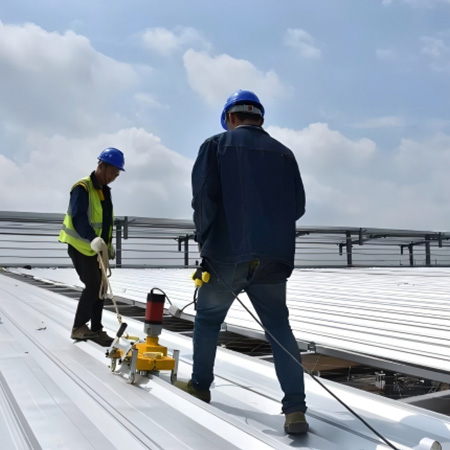 海美防水瓦以鋼板為基板,表面貼覆具有防水防腐功能的TPO/PVC卷材(熱塑性聚烯烴類防水卷材),是海美金屬推出的新一代防水防腐屋面建筑材料。海美防水瓦主要特點就是在各類環境下不易生銹不易漏水,使用熱風焊接進行相連,覆蓋全部裸露的縫隙,在使用過程中可以達到蓄水不滲透的效果,防水效果好,同時還有較好的抗風揭性能和耐老化性能,為鋼結構建筑屋面提供了長久的防護。